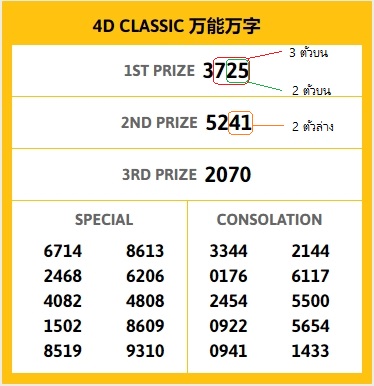การแทงหวยมาเลย์ในประไทยนั้น เราจะนับเลขของรางวัลที่ 1 เพียงเลขบน3 ตัวของรางวัลที่ 1 ในรูปคือเลข 3725 เลข3ตัวบน(725) ส่วนเลข 2ตัวบน คือ (25) และเลข 2 ตัวล่าง เราจะนับเลขของรางวัลที่ 2 เพียงเลข 2ตัวของรางวัลที่ 2 ในรูปคือเลข 5241 เลข 2 ตัวล่าง(41) นั้นเอง
